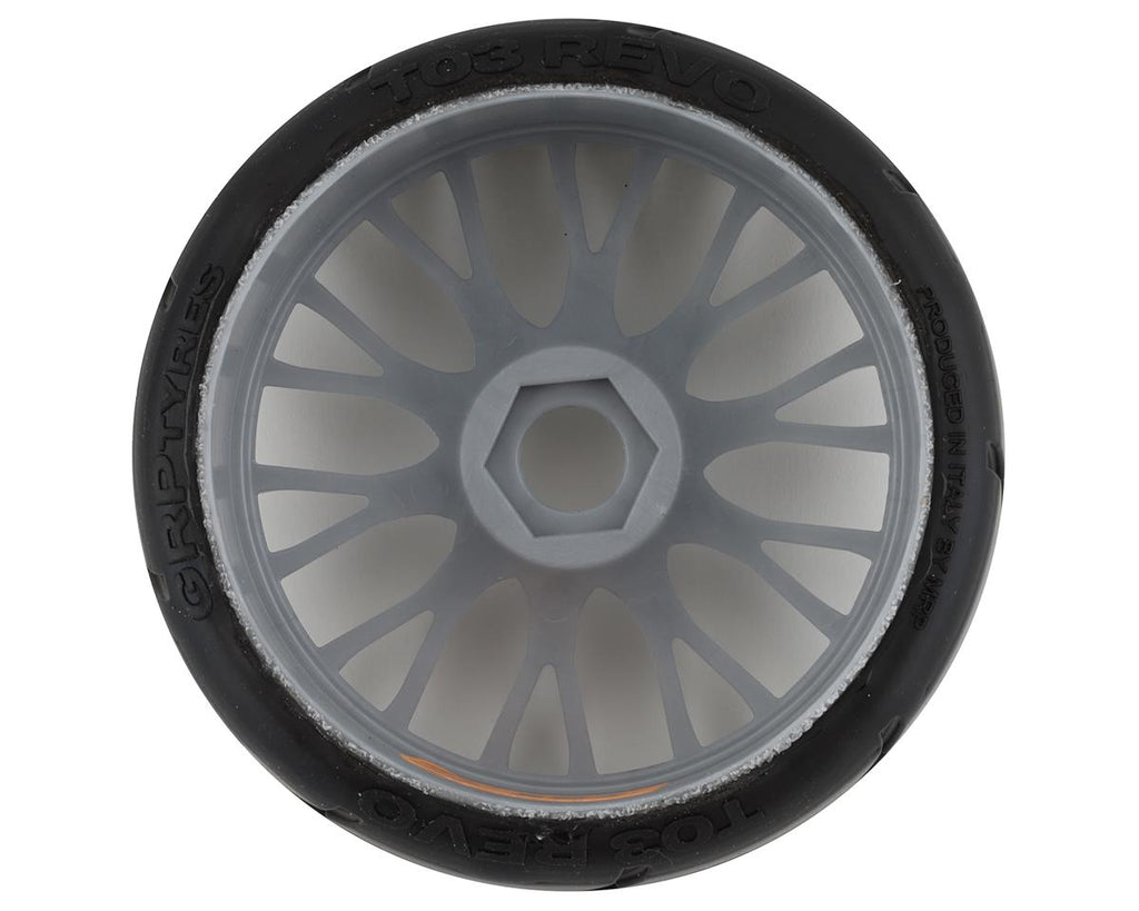 GRP GT - TO3 Revo Belted Pre-Mounted 1/8 Buggy Tires. These tires are mounted on silver GRP 20 spoke FLEX wheels.