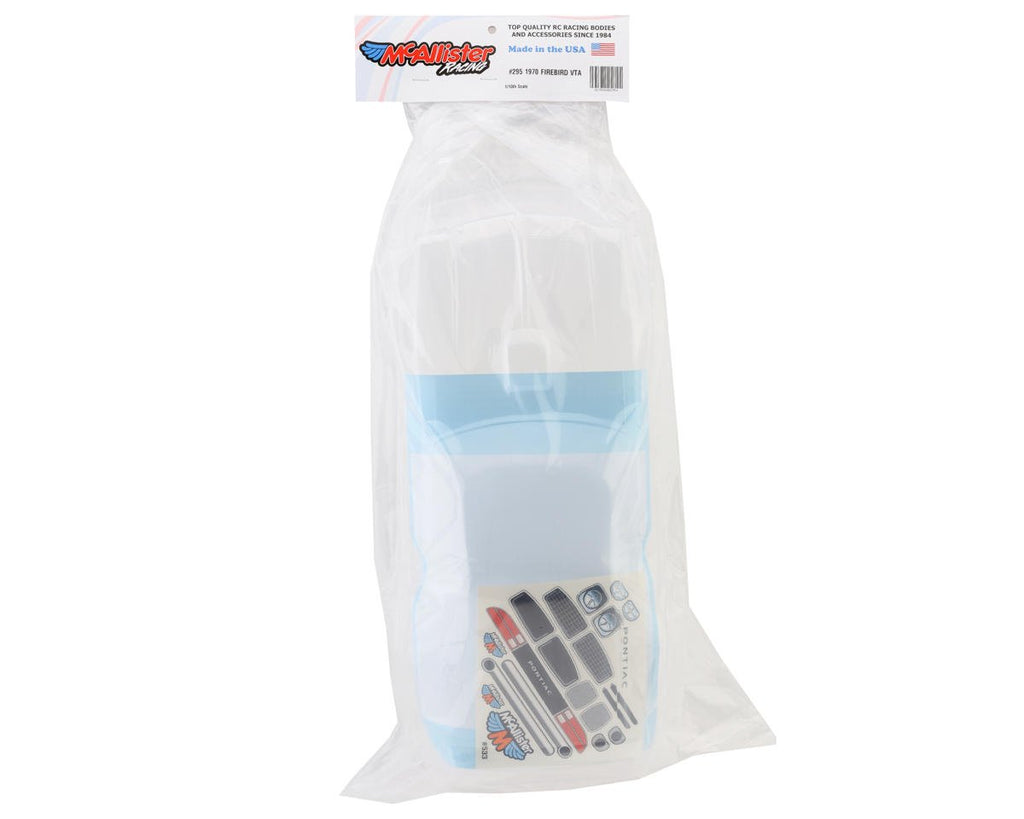 McAllister Racing 1970 Pontiac Firebird 1/10 On-Road VTA Body. This 1/10 scale clear Lexan RC car body, perfect for 200mm touring cars. Made from genuine American-made .030 thick Lexan, this body provides durability and high performance. The package includes window masks, an outer overspray film, and detailed decals for easy customization. This body is ideal for racers aiming to reduce weight while maintaining a sleek and robust design for competitive racing.