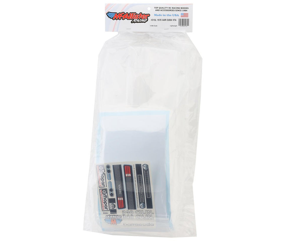 McAllister Racing AAR Cuda 1/10 On-Road VTA Body. This 1/10 scale clear Lexan RC car body, perfect for 200mm touring cars. Made from genuine American-made .030 thick Lexan, this body provides durability and high performance. The package includes window masks, an outer overspray film, and detailed decals for easy customization. This body is ideal for racers aiming to reduce weight while maintaining a sleek and robust design for competitive racing.