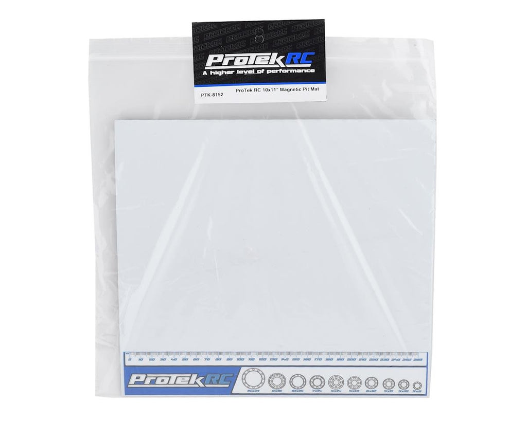 The convenient 10" tall, 11" wide size makes the ProTek Magnetic Mat easy to stash away in a variety of spaces. The pre applied decal features a 0-260mm scale that can be used to measure screw lengths, turnbuckles, links, wire lengths and more! Plus, we added bearing profiles to the decal to help identify common bearing sizes from 5x8 to 15x21. The white vinyl surface makes small parts easy to see, is stain resistant, and is easy to clean with soap and water. As an added bonus - the mat fits perfectly inside the instruction manual/setup sheet pocket on the right side of the ProTek P-8 Hauler Bag (PTK-8000). So if you are serious about wrenching and have been looking for a multi-use product to help optimize your work space, the ProTek 10x11" Magnetic Pit Mat is an affordable solution that every hobbiest can fit into their routine.
